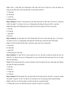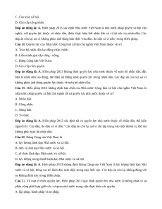 Câu 2. Về chế độ chính trị, Hiến pháp 2013 đã khẳng định quyền lực tối cao của nhà nước là thuộc về A. Quốc hội. B. Chủ tịch nước. C. Chính phủ. D. Đảng Cộng sản.