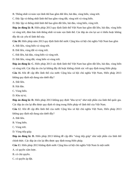 Câu 10. Hiến pháp năm 2013 quy định lãnh thổ nước Cộng hòa xã hội chủ nghĩa Việt Nam bao gồm