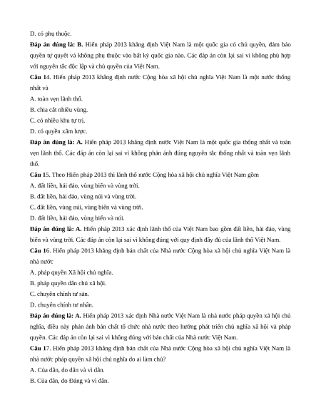 Câu 14. Hiến pháp 2013 khẳng định nước Cộng hòa xã hội chủ nghĩa Việt Nam là một nước thống nhất và A. toàn vẹn lãnh thổ. B. chia cắt nhiều vùng. C. có nhiều khu tự trị. D. có quyền xâm lược.
