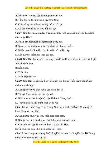 Câu 8: Nhà Hán đưa người Hán sang Giao Châu là biểu hiện của chính sách gì? A. Cai trị tàn bạo. B. Đồng hóa. C. Thân dân. D. Phân biệt dân tộc.