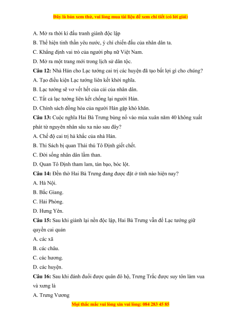 Câu 15: Sau khi giành lại nền độc lập, Hai Bà Trưng vẫn để Lạc tướng giữ quyền cai quản A. các xã B. các châu. C. các hương. D. các huyện.