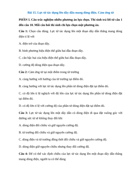 Câu 1: Chọn câu đúng. Lực từ tác dụng lên một đoạn dây dẫn thẳng mang dòng điện tỉ lệ với