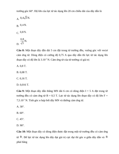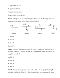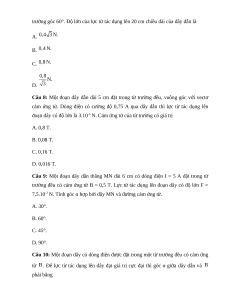 Câu 8: Một đoạn dây dẫn dài 5 cm đặt trong từ trường đều, vuông góc với vectơ