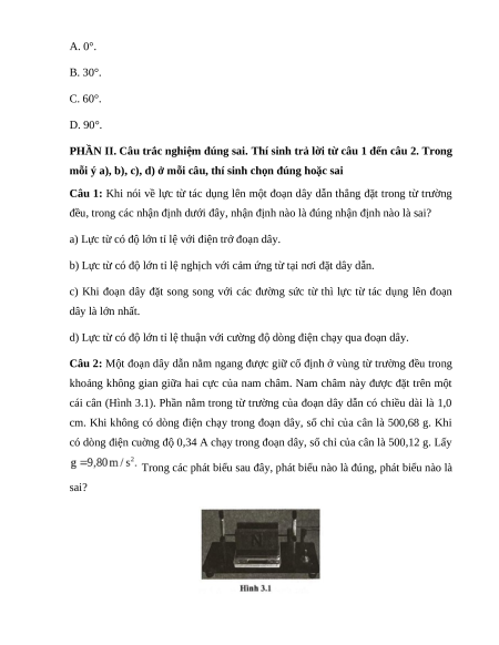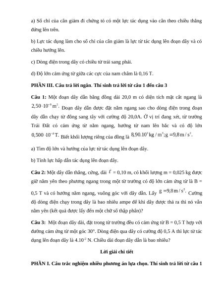 Câu 10: Một đoạn dây có dòng điện được đặt trong một từ trường đều có cảm ứng