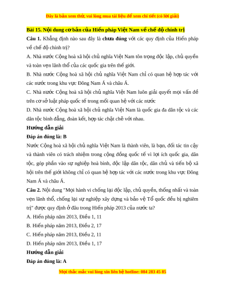 Đây là bản xem th , vu ử i lòng mua tài li u ệ đ xe ể m chi ti t (c ế ó l i ờ gi i ả ) Bài 15. N i ộ dung c b ơ n c ả a H ủ i n pháp ế Vi t ệ Nam v ch ề đ ế chí ộ nh trị Câu 1. Kh ng ẳ đ nh