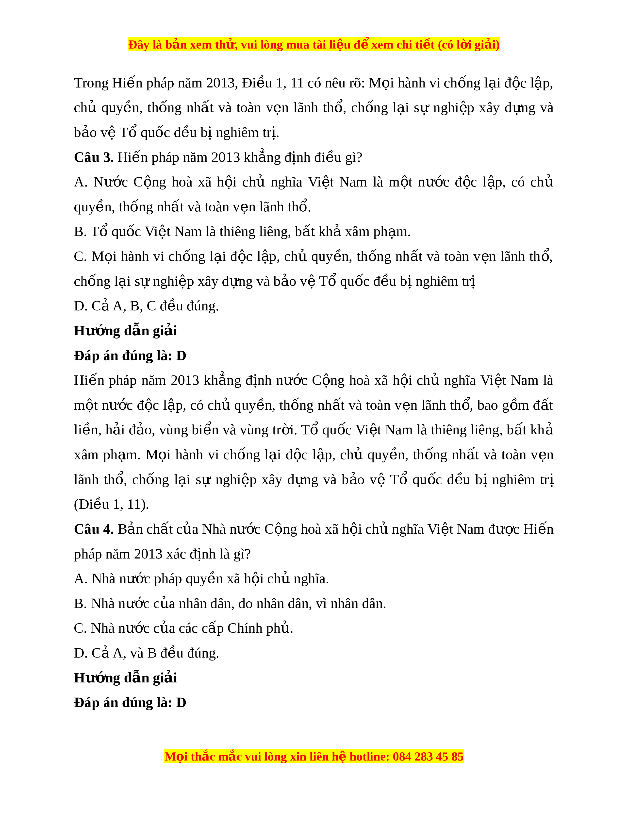 ệ Nam là thiêng liêng, b t ấ kh xâm ả ph m ạ . C. M i ọ hành vi ch ng ố l i ạ đ c ộ l p, ậ chủ quy n, ề th ng ố nh t ấ và toàn v n ẹ lãnh th , ổ chống l i ạ s nghi ự ệp xây d ng và b ự o ả v ệ T qu ổ ốc đ u b ề nghi ị êm trị D. C ả A, B, C đ u ề đúng. Hư ng d ớ ẫn gi i ả Đáp án đúng là: D Hi n ế pháp năm 2013 kh ng ẳ đ nh ị nư c ớ C ng ộ hoà xã h i ộ chủ nghĩa Vi t ệ Nam là m t ộ nư c ớ đ c ộ l p, ậ có chủ quy n, ề th ng ố nh t ấ và toàn v n ẹ lãnh th , ổ bao g m ồ đ t ấ li n, ề h i ả đ o, ả vùng bi n ể và vùng tr i ờ . T ổ qu c ố Vi t