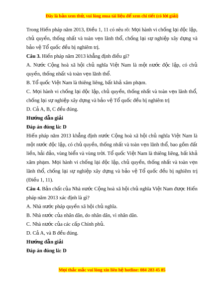 ệ Nam là thiêng liêng, b t ấ khả xâm ph m ạ . M i ọ hành vi ch ng ố l i ạ đ c ộ l p, ậ chủ quy n, ề th ng ố nh t ấ và toàn v n ẹ lãnh th , ổ ch ng ố l i ạ sự nghi p ệ xây d ng ự và b o ả vệ Tổ qu c ố đ u ề bị nghiêm trị (Đi u 1, 1 ề 1). Câu 4. B n ả ch t ấ c a N ủ hà nư c ớ C ng ộ hoà xã h i ộ ch nghĩ ủ a Vi t ệ Nam đư c H ợ i n ế
