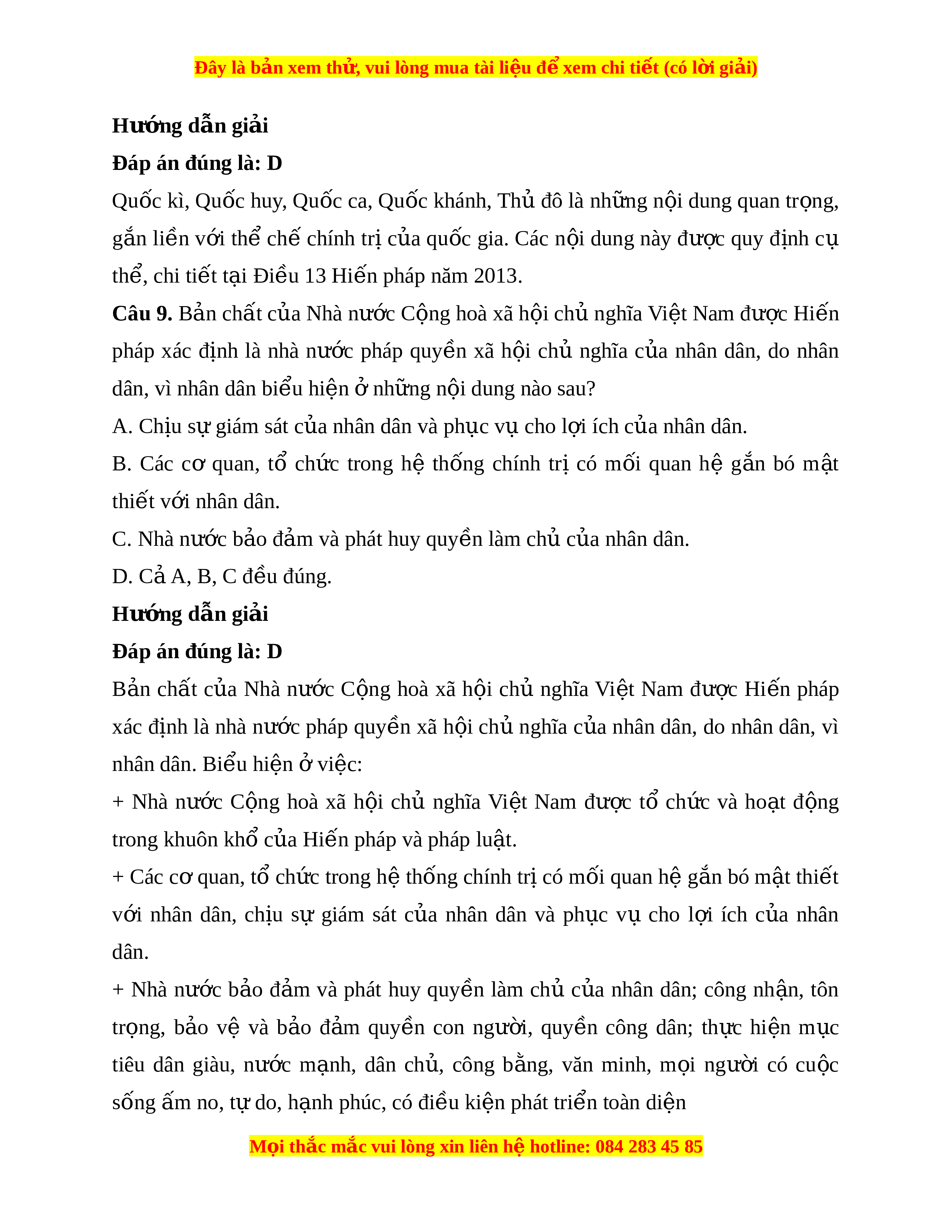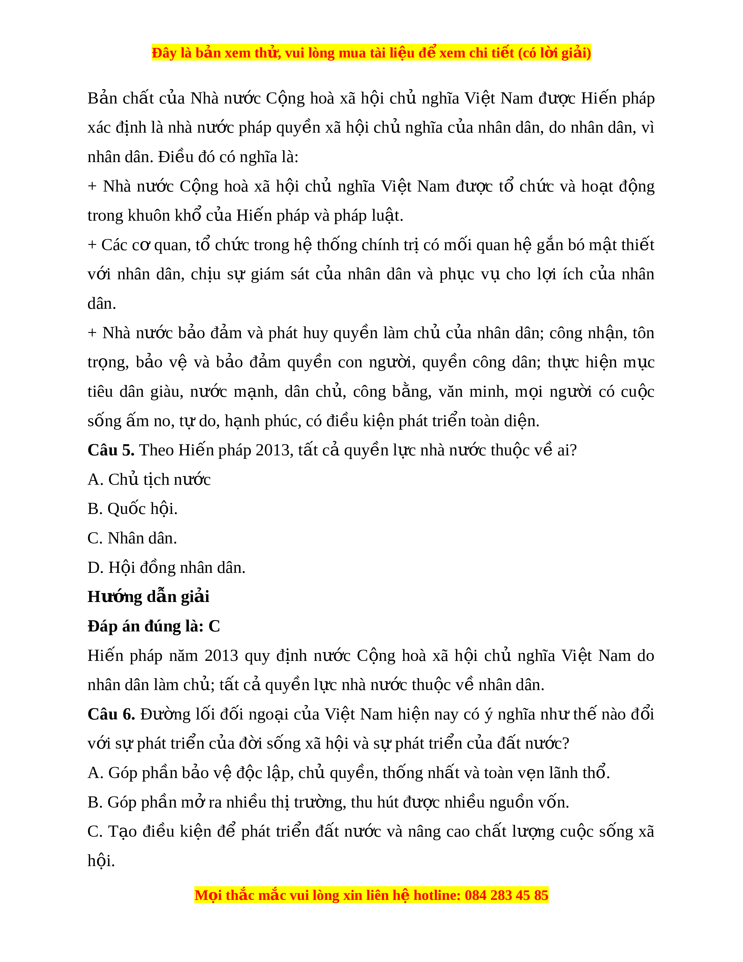Câu 5. Theo Hi n pháp 2013, t ế t ấ cả quy n l ề c nhà n ự ư c ớ thu c v ộ ai ề ? A. Chủ tịch nư c ớ B. Quốc h i ộ . C. Nhân dân. D. H i ộ đồng nhân dân. Hư ng d ớ ẫn gi i ả Đáp án đúng là: C Hi n ế pháp năm 2013 quy đ nh ị nư c ớ C ng ộ hoà xã h i ộ chủ nghĩa Vi t ệ Nam do nhân dân làm ch ; ủ t t ấ c quy ả n l ề c ự nhà nư c t ớ hu c ộ v nhân dân. ề Câu 6. Đư ng ờ l i ố đ i ố ngo i ạ c a ủ Vi t ệ Nam hi n ệ nay có ý nghĩa nh ư th ế nào đ i ổ v i ớ s phát ự tri n c ể a đ ủ i ờ sống xã h i ộ và sự phát tri n c ể a ủ đ t ấ nư c? ớ A. Góp phần b o ả v đ ệ c l ộ p, ch ậ ủ quy n, t ề h ng nh ố t ấ và toàn v n l ẹ ãnh th . ổ B. Góp ph n m ầ r ở a nhi u ề th t ị rư ng, t ờ hu hút đư c ợ nhi u ề ngu n v ồ n. ố C. T o ạ đi u ề ki n ệ để phát tri n ể đ t ấ nư c ớ và nâng cao ch t ấ lư ng ợ cu c ộ s ng ố xã h i ộ . M i