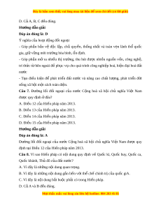 ụ cho quá trình công nghi p ệ hoá, hi n ệ đ i ạ hoá đ t ấ nư c ớ - T o ạ đi u ề ki n ệ để phát tri n ể đ t ấ nư c ớ và nâng cao ch t ấ lư ng, ợ phát tri n ể đ i ờ sống xã h i ộ m t ộ cách toàn di n. ệ Câu 7. Đư ng ờ l i ố đ i ố ngo i ạ c a ủ nư c ớ C ng ộ hoà xã h i ộ chủ nghĩa Vi t ệ Nam đư c ợ quy đ nh ị đâu? ở A. Đi u ề 12 c a H ủ i n pháp năm ế 2013. B. Đi u 13 c ề a H ủ i n ế pháp năm 2013. C. Đi u 14 c ề a H ủ i n ế pháp năm 2013. D. Đi u ề 15 c a H ủ i n pháp năm ế 2013. Hư ng d ớ ẫn gi i ả Đáp án đúng là: A Đư ng ờ lối đ i ố ngo i ạ c a ủ nư c ớ C ng ộ hoà xã h i ộ ch ủ nghĩa Vi t ệ Nam đư c ợ quy định t i ạ Đi u ề 12 c a H ủ i n pháp năm ế 2013. Câu 8. Vì sao Hi n ế pháp có n i ộ dung quy đ nh ị về Qu c ố kì, Qu c ố huy, Qu c ố ca,