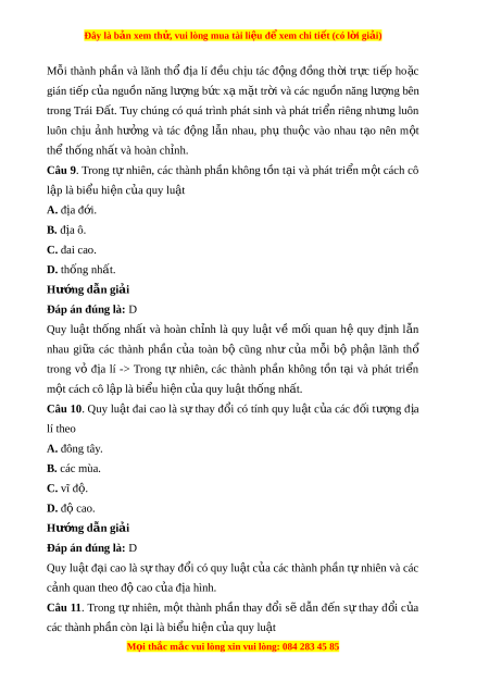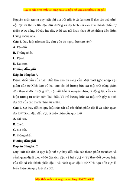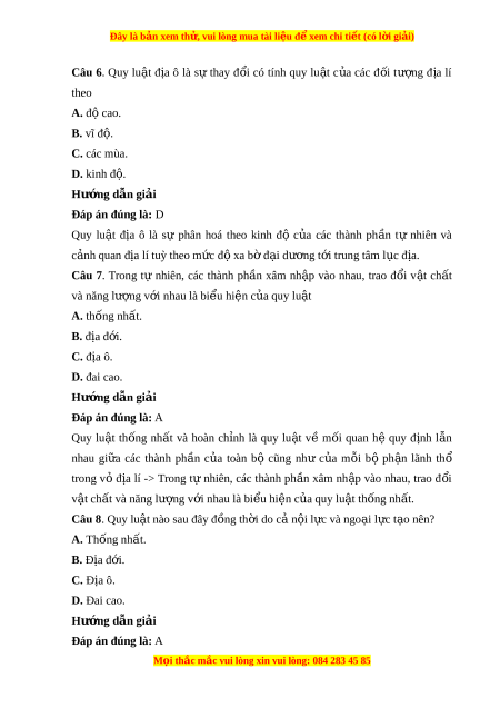 Đây là bản xem th , vu ử i lòng mua tài li u ệ đ xe ể m chi ti t ế (có l i ờ gi i ả ) Câu 6. Quy lu t ậ đ a ị ô là sự thay đ i ổ có tính quy lu t ậ c a ủ các đ i ố tư ng ợ đ a ị lí theo A. đ cao. ộ B. vĩ đ . ộ C. các mùa. D. kinh đ . ộ Hư ng ớ d n gi ẫ i ả Đáp án đúng là: D Quy lu t ậ đ a