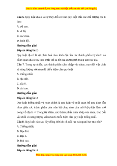 ợ tự nhiên trên Trái Đ t ấ . Vì thế lư ng ợ b c ứ xạ m t ặ tr i ờ gây ra tính địa đ i ớ c a ủ các thành ph n t ầ nhi ự ên. Câu 5. Sự thay đ i ổ có quy lu t ậ c a ủ t t ấ c ả các thành ph n ầ đ a ị lí và c nh ả quan địa lí t X ừ ích đ o ạ đ n c ế c l ự à bi u ể hi n c ệ a ủ quy lu t ậ A. đai cao. B. địa ô. C. địa đ i ớ . D. thống nhất. Hư ng d ớ ẫn gi i ả Đáp án đúng là: C Quy lu t ậ đ a ị đ i ớ là quy lu t ậ về sự thay đ i ổ c a ủ các thành ph n ầ tự nhiên và c nh ả quan đ a ị lí theo vĩ đ ( ộ t ừ xích đ o ạ v ề hai c c) ự -> S t ự hay đ i ổ có quy lu t ậ c a
