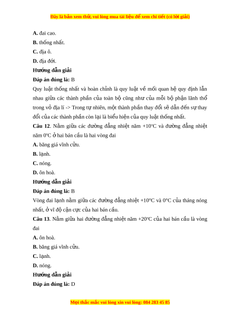 D. Vòng đai nóng, ôn hoà, l nh, ạ băng giá vĩnh c u. ử Hư ng ớ d n gi ẫ i ả Đáp án đúng là: D Các vòng đai nhi t ệ từ Xích đ o ạ đ n ế c c ự đư c ợ s p ắ x p ế theo thứ tự là: Vòng đai nóng, ôn hoà, l nh và ạ băng giá vĩnh c u. ử Câu 2. Quy lu t ậ đ a ị đ i ớ là sự thay đ i ổ có tính quy lu t ậ c a ủ các đ i ố tư ng ợ đ a ị lí theo A. đ cao. ộ B. kinh đ . ộ C. các mùa. D. vĩ đ . ộ Hư ng ớ d n gi ẫ i ả Đáp án đúng là: D Quy lu t ậ đ a ị đ i ớ là quy lu t ậ về sự thay đ i ổ c a ủ các thành ph n ầ tự nhiên và c nh quan ả
