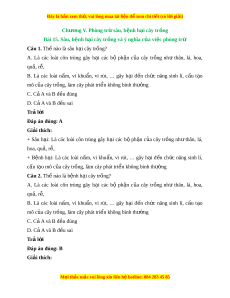 uân canh, xen canh cây tr ng nh ồ m ằ lo i ạ bỏ m m ầ sâu, b nh. ệ B. Là dùng s c ứ ngư i ờ , d ng ụ c , ụ máy móc, b y ẫ đ ể ngăn ch n, ặ b t ắ , tiêu di t ệ , lo i ạ bỏ sâu, bệnh h i ạ . C. Là sử d ng ụ sinh v t ậ có ích ho c ặ s n ả ph m ẩ c a ủ chúng để tiêu di t ệ sâu, b nh ệ h i ạ cây trồng D. Là sử d ng t ụ huốc hóa h c đ ọ phòng t ể r s ừ âu, b nh h ệ i ạ Trả l i ờ Đáp án đúng: B Giải thích: + Bi n