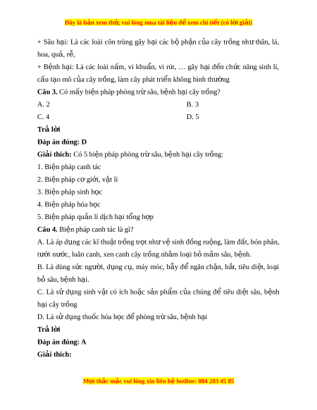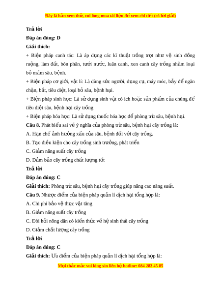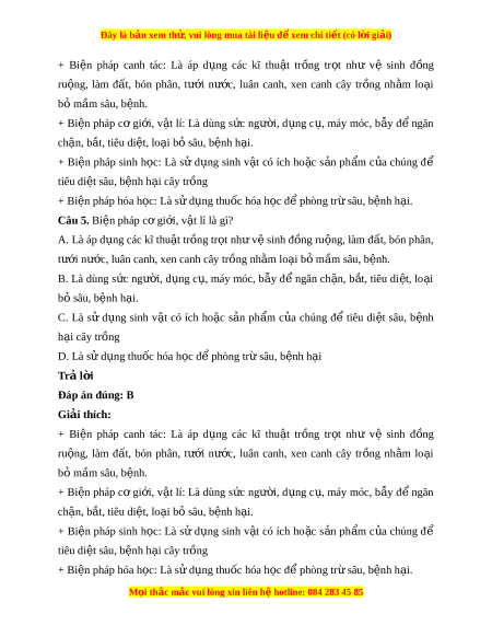 uân canh, xen canh cây tr ng nh ồ m ằ lo i ạ bỏ m m ầ sâu, b nh. ệ B. Là dùng s c ứ ngư i ờ , d ng ụ c , ụ máy móc, b y ẫ đ ể ngăn ch n, ặ b t ắ , tiêu di t ệ , lo i ạ bỏ sâu, bệnh h i ạ . C. Là sử d ng ụ sinh v t ậ có ích ho c ặ s n ả ph m ẩ c a ủ chúng để tiêu di t ệ sâu, b nh ệ h i ạ cây trồng D. Là sử d ng t ụ huốc hóa h c đ ọ phòng t ể r s ừ âu, b nh h ệ i ạ Trả l i ờ Đáp án đúng: A Giải thích: M i