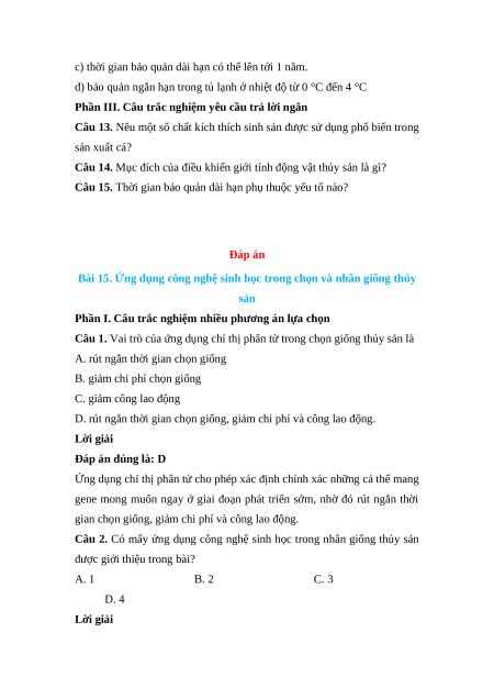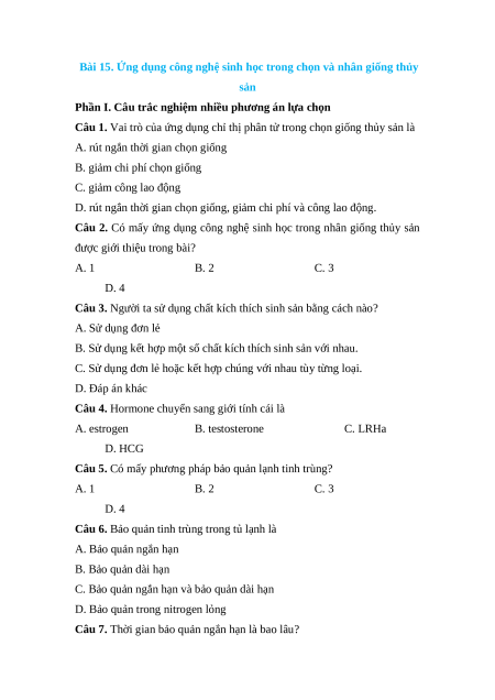 Câu 11. Ứng dụng công nghệ sinh học trong nhân giống thủy sản bằng