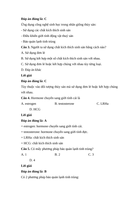 Câu 3. Người ta sử dụng chất kích thích sinh sản bằng cách nào? A. Sử dụng đơn lẻ