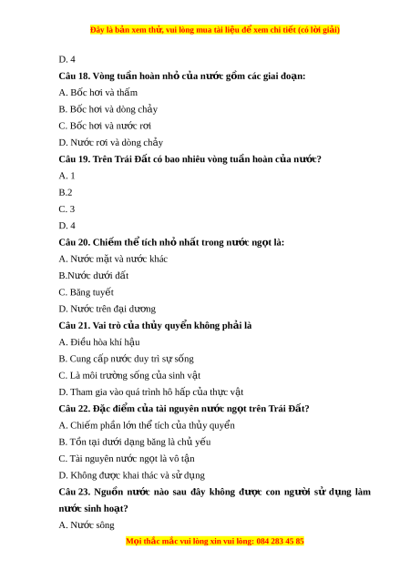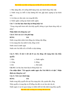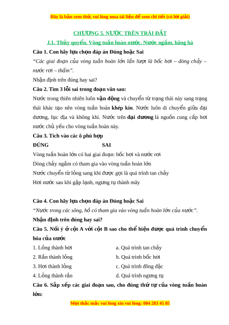 Đây là bản xem th , vu ử i lòng mua tài li u ệ đ xe ể m chi ti t ế (có l i ờ gi i ả ) CHƯ N Ơ G 5. NƯ C Ớ TRÊN TRÁI Đ T Ấ J.1. T hủy quy n. ể Vòng tu n hoà ầ n nư c. ớ Nư c ng ớ m ầ , băng hà Câu 1. Con hãy l a ch ự n đáp án Đ ọ úng ho c Sai ặ “Các giai đo n ạ c a ủ vòng tu n ầ hoàn l n ớ l n ầ lư t ợ là b c ố h i ơ – dòng ch y ả – nư c r ớ i ơ – th m ấ ”. Nh n đ ậ ịnh trên đúng hay sai? Câu 2. Tìm 3 l i