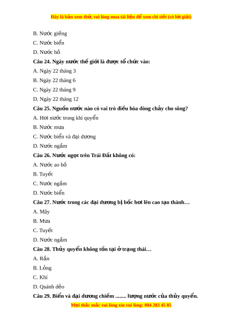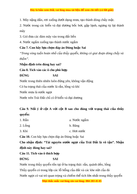 Đây là bản xem th , vu ử i lòng mua tài li u ệ đ xe ể m chi ti t ế (có l i ờ gi i ả ) 1. Mây n ng ặ dần, r i ơ xuống dư i ớ d ng ạ m a, t ư o ạ thành dòng ch y m ả t ặ . 2. Nư c ớ trong các bi n ể và đ i ạ dư ng ơ b c ố h i ơ , g p ặ l nh, ạ ng ng ư tụ l i ạ thành mây 3. Gió đ a các ư đám mây vào trong đ t ấ li n ề 4. Nư c ng ớ ấm xuống t o t ạ hành nư c ớ ng m ầ Câu 7. Con hãy l a ch ự n đáp án Đ ọ úng ho c Sai ặ “Trong vòng tu n ầ hoàn nh ỏ c a ủ th y ủ quy n,