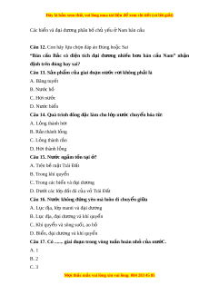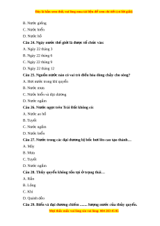 ấ có bao nhiêu vòng tu n hoàn c ầ a n ủ ư c? ớ A. 1 B.2 C. 3 D. 4 Câu 20. Chi m ế th t ể ích nh nh ỏ t ấ trong nư c ớ ng t ọ là: A. Nư c m ớ t ặ và nư c ớ khác B.Nư c ớ dư i ớ đ t ấ C. Băng tuy t ế D. Nư c t ớ rên đ i ạ dư ng ơ Câu 21. Vai trò c a t ủ h y quy ủ n khô ể ng ph i ả là A. Đi u hòa khí ề h u ậ B. Cung c p n ấ ư c duy t ớ rì s s ự ng ố C. Là môi trư ng ờ s ng c ố a s ủ inh v t ậ