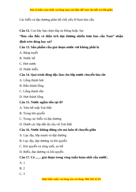 Đây là bản xem th , vu ử i lòng mua tài li u ệ đ xe ể m chi ti t ế (có l i ờ gi i ả ) Các bi n ể và đ i ạ dư ng ơ phân b ch ố ủ y u ế N ở am bán c u ầ Câu 12. Con hãy l a ự ch n đáp án Đ ọ úng hoặc Sai “Bán c u ầ B c ắ có di n ệ tích đ i ạ dư ng ơ nhi u ề h n ơ bán c u ầ Nam” nh n ậ đ n
