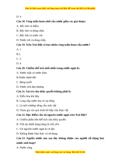 Câu 18. Vòng tuần hoàn nh c ỏ a n ủ ư c g ớ m ồ các giai đo n ạ : A. Bốc h i ơ và thấm B. Bốc h i ơ và dòng ch y ả C. Bốc h i ơ và nư c r ớ i ơ D. Nư c r ớ i ơ và dòng ch y ả