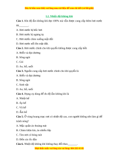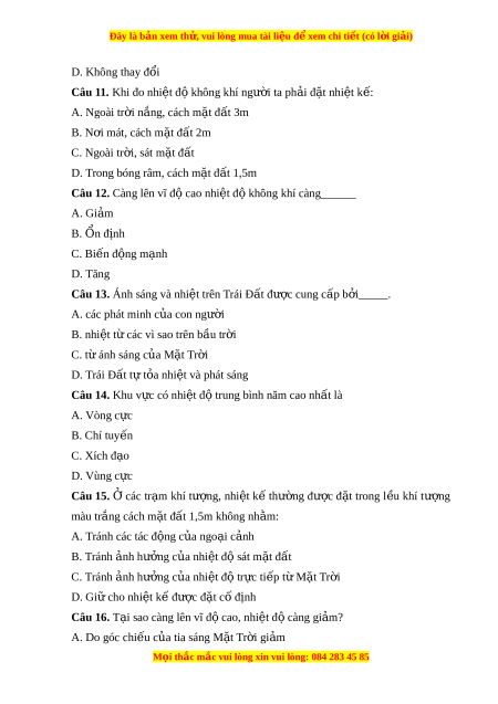Đây là bản xem th , vu ử i lòng mua tài li u ệ đ xe ể m chi ti t ế (có l i ờ gi i ả ) D. Không thay đổi Câu 11. Khi đo nhi t ệ đ không khí ộ ngư i ờ ta ph i ả đ t ặ nhi t ệ k : ế A. Ngoài tr i ờ n ng, cách ắ m t ặ đ t ấ 3m B. N i ơ mát, cách m t ặ đ t ấ 2m C. Ngoài tr i ờ , sát m t ặ đ t ấ D. Trong bóng râm, cách m t ặ đ t ấ 1,5m