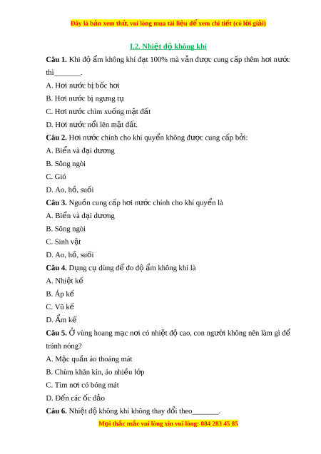 Đây là bản xem th , vu ử i lòng mua tài li u ệ đ xe ể m chi ti t ế (có l i ờ gi i ả ) I .2. N hi t ệ đ không k ộ hí Câu 1. Khi độ m ẩ không khí đ t ạ 100% mà v n ẫ đư c ợ cung c p ấ thêm h i ơ nư c ớ thì_______. A. H i ơ nư c ớ b b ị c h ố i ơ B. H i ơ nư c b ớ ng ị ng t ư ụ C. H i ơ nư c chì ớ m xu ng m ố t ặ đ t ấ D. H i ơ nư c ớ n i ổ lên m t ặ đ t ấ . Câu 2. H i ơ nư c
