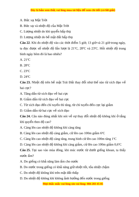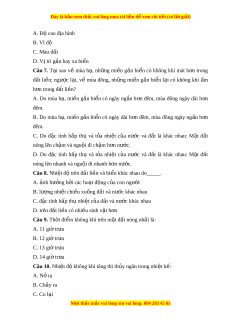 Đây là bản xem th , vu ử i lòng mua tài li u ệ đ xe ể m chi ti t ế (có l i ờ gi i ả ) A. Đ cao đ ộ ịa hình B. Vĩ độ C. Màu đất D. Vị trí g n hay xa bi ầ n ể Câu 7. T i ạ sao về mùa h , ạ nh ng ữ mi n ề g n ầ bi n ể có không khí mát h n ơ trong đ t ấ li n; ề ngư c ợ l i ạ , về mùa đông, nh ng ữ mi n ề g n ầ bi n ể l i ạ có không khí m ấ h n t ơ rong đ t ấ li n? ề A. Do mùa h , ạ mi n ề g n ầ bi n ể có ngày ng n ắ h n