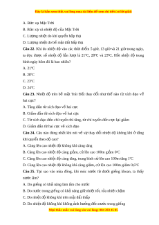 ạ sao không đo lúc 12 giờ tr a? ư A. Vì lúc đó tr i ờ quá n ng ắ B. Vì nhi t ệ ch a ph ư n ả h i ồ vào không khí C. Vì góc chi u ế c a ánh s ủ áng M t ặ Tr i ờ ch a đ ư l ủ n ớ D. Vì th i ờ gian đo đã đư c ợ quy ư c ớ Câu 20. Khi th c ự hi n ệ 4 l n ầ đo nhi t ệ đ , ộ ta thư ng ờ đo vào nh ng ữ khung giờ nào? A. 1 gi , 5 gi ờ , 13 gi ờ và 21 gi ờ ờ B. 2 gi , 5 gi ờ , ờ 13 gi và 20 gi ờ ờ C. 1 gi , 6 gi ờ , ờ 13 gi và 18 gi ờ ờ D. 1 gi , 7 gi ờ , 13 gi ờ và 19 gi ờ ờ Câu 21. Nhi t ệ đ không khí ộ đư c hì ợ nh thành t : ừ M i