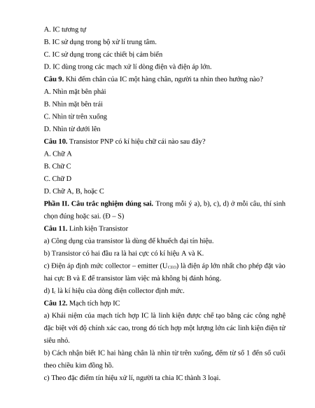 Câu 9. Khi đếm chân của IC một hàng chân, người ta nhìn theo hướng nào? A. Nhìn mặt bên phải B. Nhìn mặt bên trái C. Nhìn từ trên xuống D. Nhìn từ dưới lên