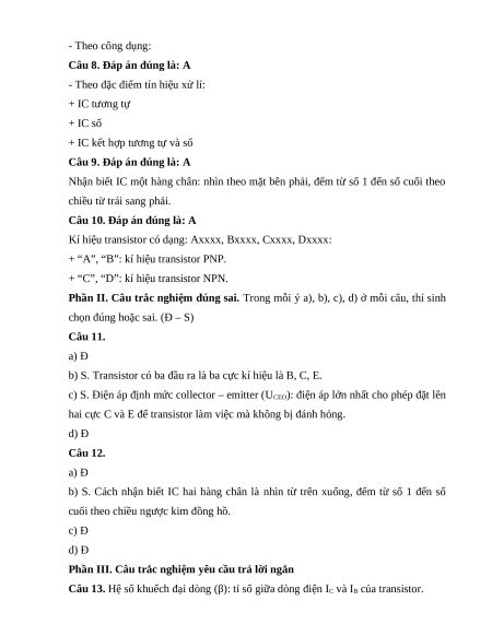 Câu 7. Có mấy cách phân loại mạch tích hợp IC? A. 1 B. 2 C. 3 D. 4