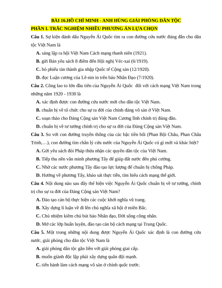 Câu 1. Sự kiện đánh dấu Nguyễn Ái Quốc tìm ra con đường cứu nước đúng đắn cho dân tộc Việt Nam là