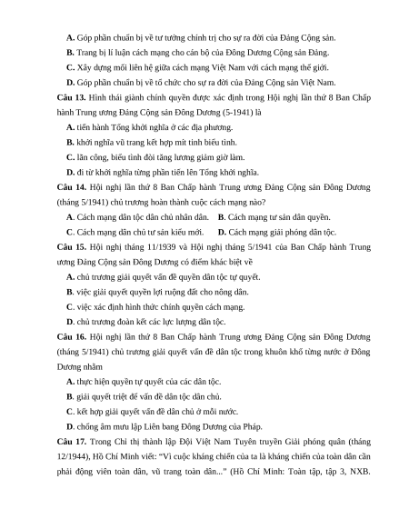 Câu 16. Hội nghị lần thứ 8 Ban Chấp hành Trung ương Đảng Cộng sản Đông Dương