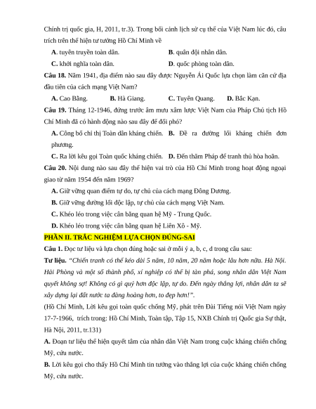 Câu 19. Tháng 12-1946, đứng trước âm mưu xâm lược Việt Nam của Pháp Chủ tịch Hồ