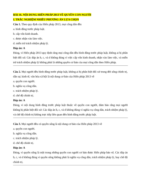 Câu 3. Mọi người đều có quyền sống là nội dung cơ bản của Hiến pháp 2013 về a. quyền con người. b. nghĩa vụ công dân. c. trách nhiệm pháp lý. d. chế độ chính trị. Đáp án: A