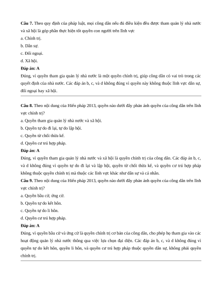 Câu 10. Theo quy định của Hiến pháp và pháp luật, trên lĩnh vực chính trị, mọi công dân đều có quyền được