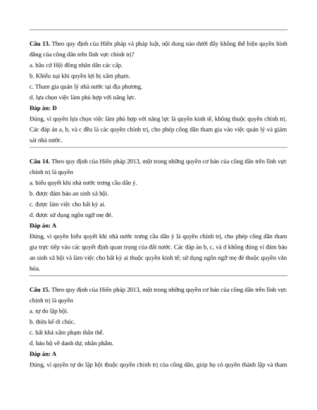 Câu 9. Theo nội dung của Hiến pháp 2013, quyền nào dưới đây phản ánh quyền của công dân trên lĩnh vực chính trị?