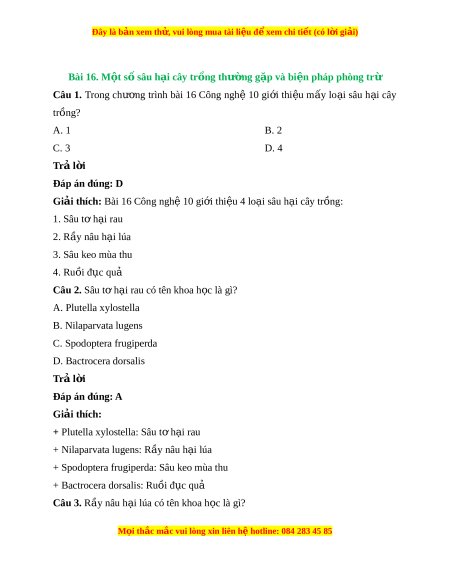 Đây là bản xem th , vu ử i lòng mua tài li u ệ đ xe ể m chi ti t (c ế ó l i ờ gi i ả ) Bài 16. M t ộ số sâu h i ạ cây tr ng ồ thư ng g ờ p và b ặ i n pháp phò ệ ng trừ Câu 1. Trong chư ng ơ trình bài 16 Công ngh ệ 10 gi i ớ thi u ệ m y ấ lo i ạ sâu h i ạ cây trồng? A. 1 B. 2 C. 3 D. 4 Trả l i ờ Đáp án đúng: D