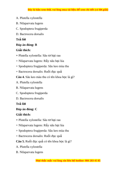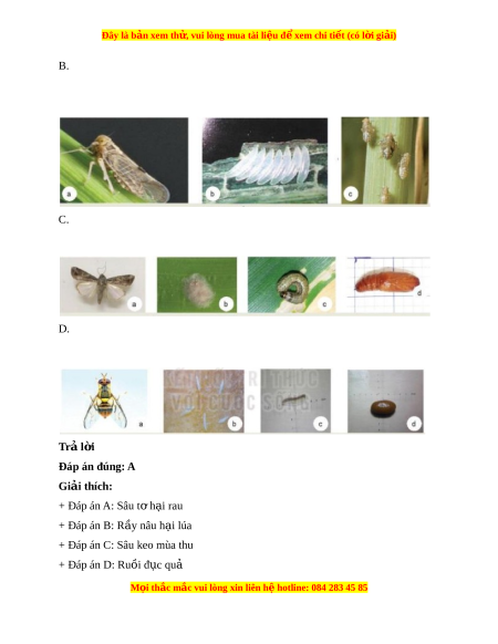 Đây là bản xem th , vu ử i lòng mua tài li u ệ đ xe ể m chi ti t (c ế ó l i ờ gi i ả ) A. Plutella xylostella B. Nilaparvata lugens C. Spodoptera frugiperda D. Bactrocera dorsalis Trả l i ờ Đáp án đúng: B Giải thích: