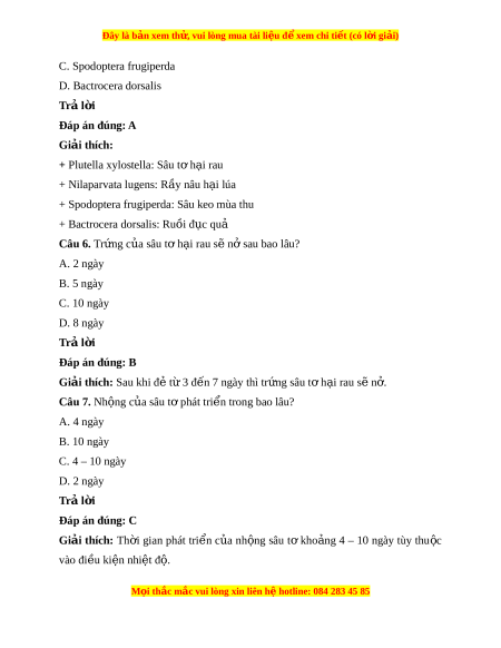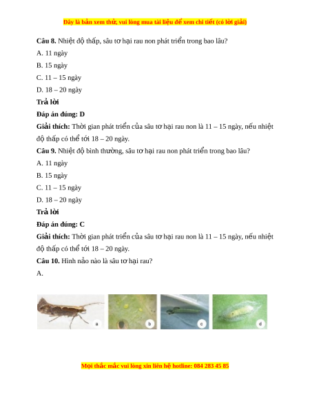 Đây là bản xem th , vu ử i lòng mua tài li u ệ đ xe ể m chi ti t (c ế ó l i ờ gi i ả ) Câu 8. Nhi t ệ đ t ộ h p, s ấ âu t h ơ i ạ rau non phát tri n ể trong bao lâu? A. 11 ngày B. 15 ngày C. 11 – 15 ngày D. 18 – 20 ngày Trả l i ờ Đáp án đúng: D Giải thích: Th i ờ gian phát tri n c ể a s ủ âu t h ơ i