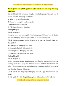 ề và nghĩa vụ cơ b n ả c a ủ công dân trong Hi n pháp ế Câu 1. Nh ng ữ l i ợ ích cơ b n ả mà công dân đư c ợ hư ng, ở đư c ợ Nhà nư c ớ b o ả vệ và đ m ả b o t ả heo Hi n ế pháp, pháp lu t ậ là A. Nghĩa v c ụ b ơ n ả c a công dân. ủ B. Các quy n ề con ngư i ờ , quy n công dân. ề C. Quy n c ề b ơ n ả c a công ủ dân. D. Việc th c ự hi n quy ệ n ề công dân. Hư ng d ớ ẫn gi i ả Đáp án đúng là: A Nh ng ữ l i ợ ích c ơ b n ả mà công dân đư c ợ hư ng, ở đư c ợ Nhà nư c ớ b o ả v ệ và đ m ả b o ả theo Hi n pháp, pháp l ế u t ậ g i ọ là nghĩa v c ụ b ơ n c ả a ủ công dân. Câu 2. Quy n ề con ngư i ờ , quy n ề và nghĩa vụ cơ b n ả c a ủ công dân đư c ợ quy định t i ạ đâu? A. Chư ng I ơ c a H ủ i n pháp ế năm 2013. B. Chư ng ơ II c a H ủ i n pháp ế năm 2013. C. Chư ng ơ III c a ủ Hi n pháp năm ế 2013. D. Chư ng I ơ V c a ủ Hi n pháp năm ế 2013. Hư ng d ớ ẫn gi i ả Đáp án đúng là: B Quy n ề con ngư i ờ , quy n ề và nghĩa vụ cơ b n ả c a ủ công dân đư c ợ quy đ nh ị t i ạ Chư ng ơ II c a ủ Hi n ế pháp năm 2013 v i ớ 36 đi u ề (từ Đi u ề 14 đ n ế Đi u ề 49) nh m ằ kh ng ẳ đ nh vai ị trò quan tr ng ọ c a ủ quy n ề con ngư i ờ , quy n ề và nghĩa v ụ cơ b n ả c a công dân ủ trong Hi n pháp. ế Câu 3. Đâu là n i ộ dung đư c ợ Hi n ế pháp năm 2013 quy đ nh ị rõ quy n ề con ngư i ờ ? A. M i ọ ngư i ờ đ u ề bình đ ng ẳ trư c pháp l ớ u t ậ , không ai b ph ị n ả bi t ệ đ i ố x . ử M i