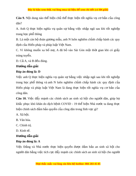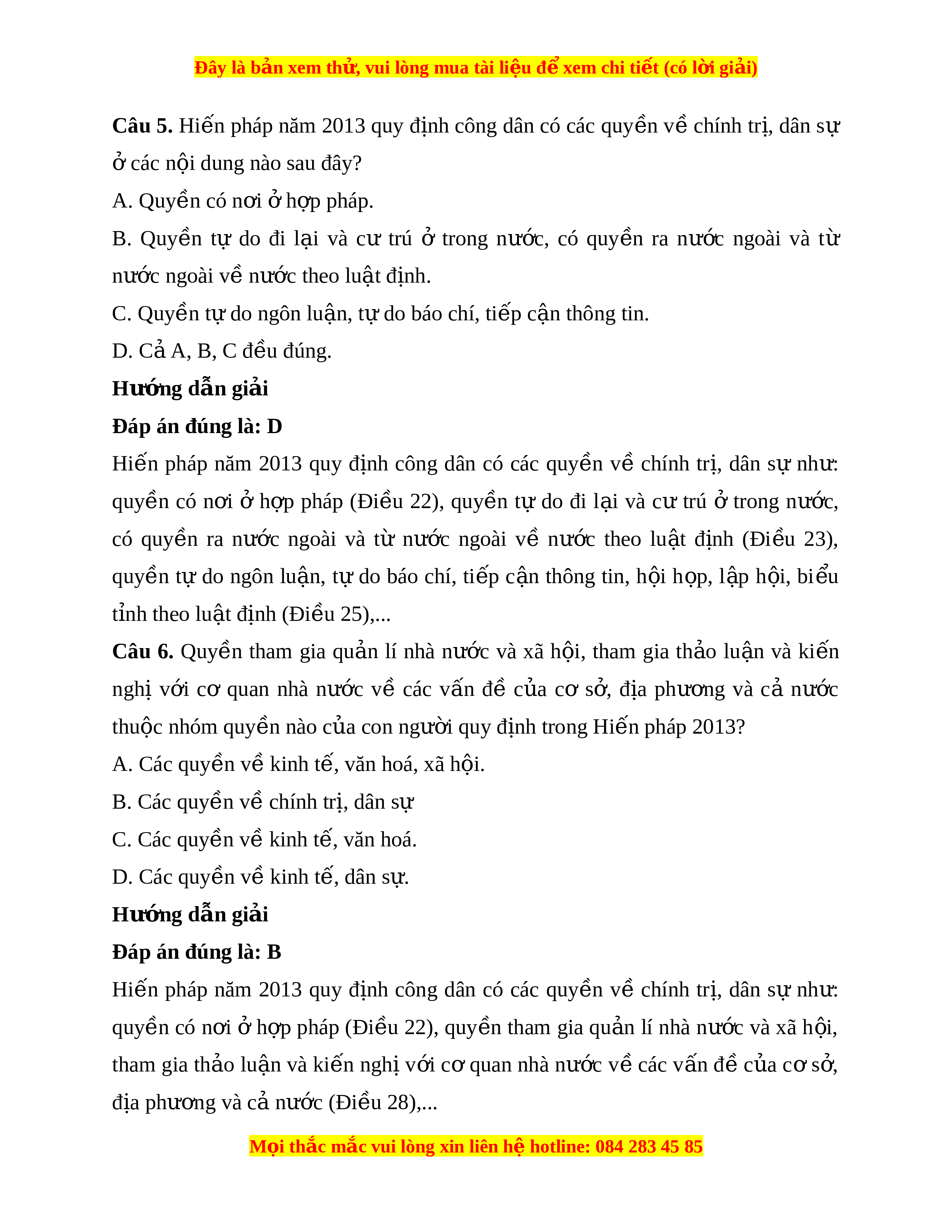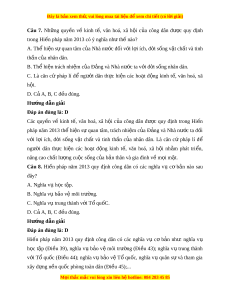 Đây là bản xem th , vu ử i lòng mua tài li u ệ đ xe ể m chi ti t (c ế ó l i ờ gi i ả ) Câu 5. Hi n ế pháp năm 2013 quy đ nh ị công dân có các quy n ề v ề chính tr ,ị dân sự ở các n i ộ dung nào sau đây? A. Quy n ề có n i ơ h ở p pháp. ợ B. Quy n ề tự do đi l i