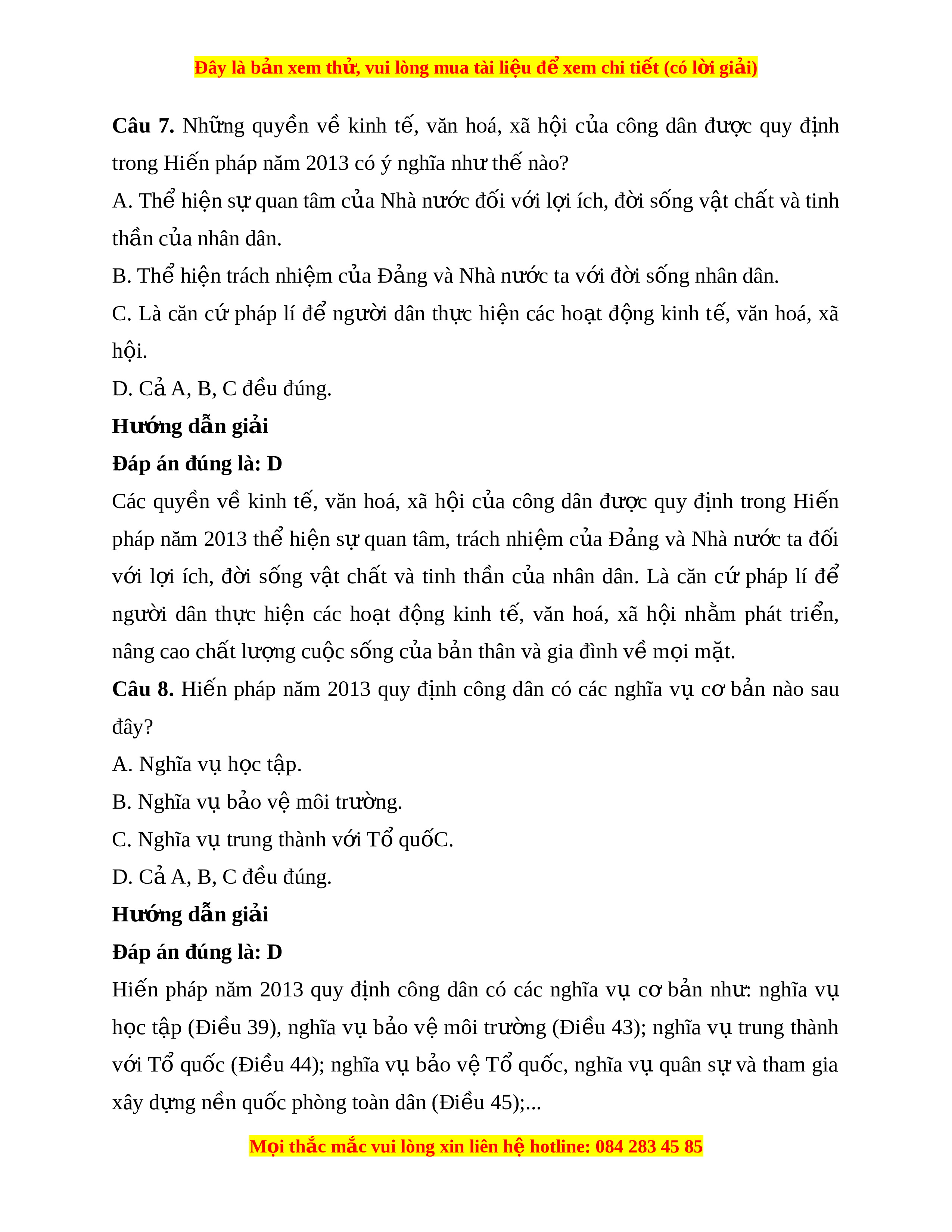 Đây là bản xem th , vu ử i lòng mua tài li u ệ đ xe ể m chi ti t (c ế ó l i ờ gi i ả ) Câu 7. Nh ng ữ quy n ề về kinh t , ế văn hoá, xã h i ộ c a ủ công dân đư c ợ quy đ nh ị trong Hi n pháp năm ế