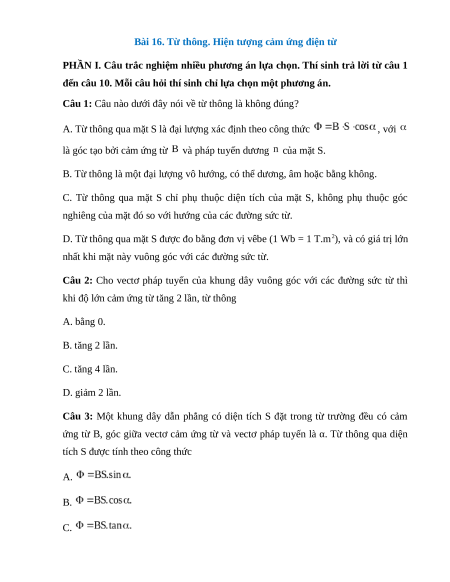 Câu 10: Vectơ cảm ứng từ của từ trường đều xuyên qua diện tích S theo phương