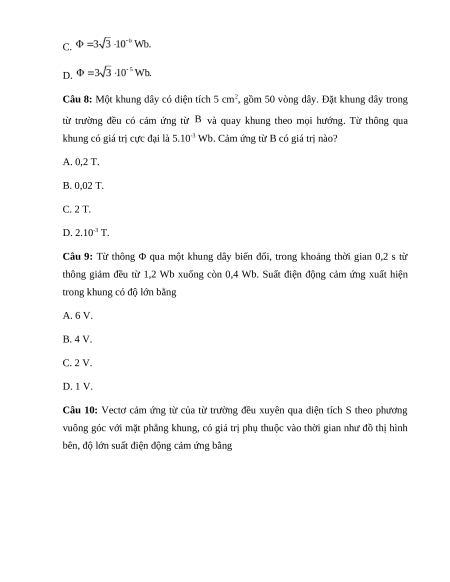 Câu 9: Từ thông Φ qua một khung dây biến đổi, trong khoảng thời gian 0,2 s từ