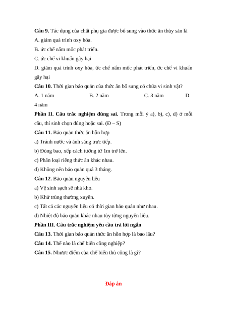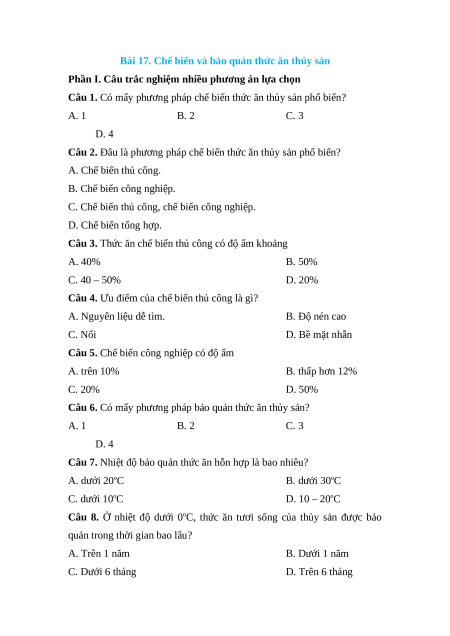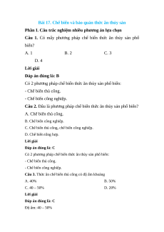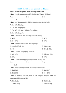 Câu 1. Có mấy phương pháp chế biến thức ăn thủy sản phổ biến? A. 1 B. 2 C. 3 D. 4