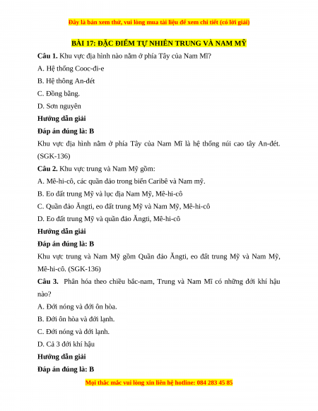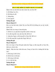 Trắc nghiệm Bài 17: Đặc điểm tự nhiên Trung và Nam Mỹ