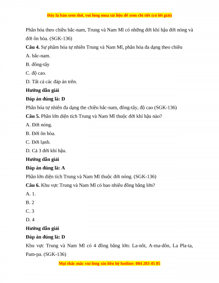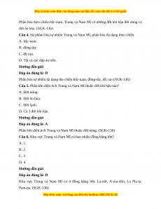 Câu 5. Phần lớn diện tích Trung và Nam Mĩ thuộc đới khí hậu nào? A. Đới nóng. B. Đới ôn hòa. C. Đới lạnh. D. Cả 3 đới khí hậu. Hướng dẫn giải Đáp án đúng là: A