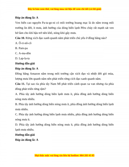 Câu 10. Rừng xích đạo xanh quanh năm phát triển chủ yếu ở đồng bằng nào? A. Ô-ri-nô-cô B. Pam-pa C. A-ma-dôn D. Lap-la-ta Hướng dẫn giải Đáp án đúng là: A