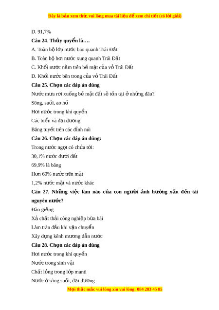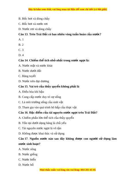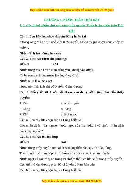Đây là bản xem th , vu ử i lòng mua tài li u ệ đ xe ể m chi ti t ế (có l i ờ gi i ả ) CHƯ N Ơ G 5. NƯ C Ớ TRÊN TRÁI Đ T Ấ L .1. C ác thành ph n ch ầ y ủ u c ế a t ủ h y q ủ uy n. ể Tu n h ầ oàn nư c t ớ rên Trái Đất Câu 1. Con hãy l a ch ự n đáp án Đ ọ úng ho c Sai ặ “Trong vòng tu n ầ hoàn nh ỏ c a ủ th y ủ quy n,
